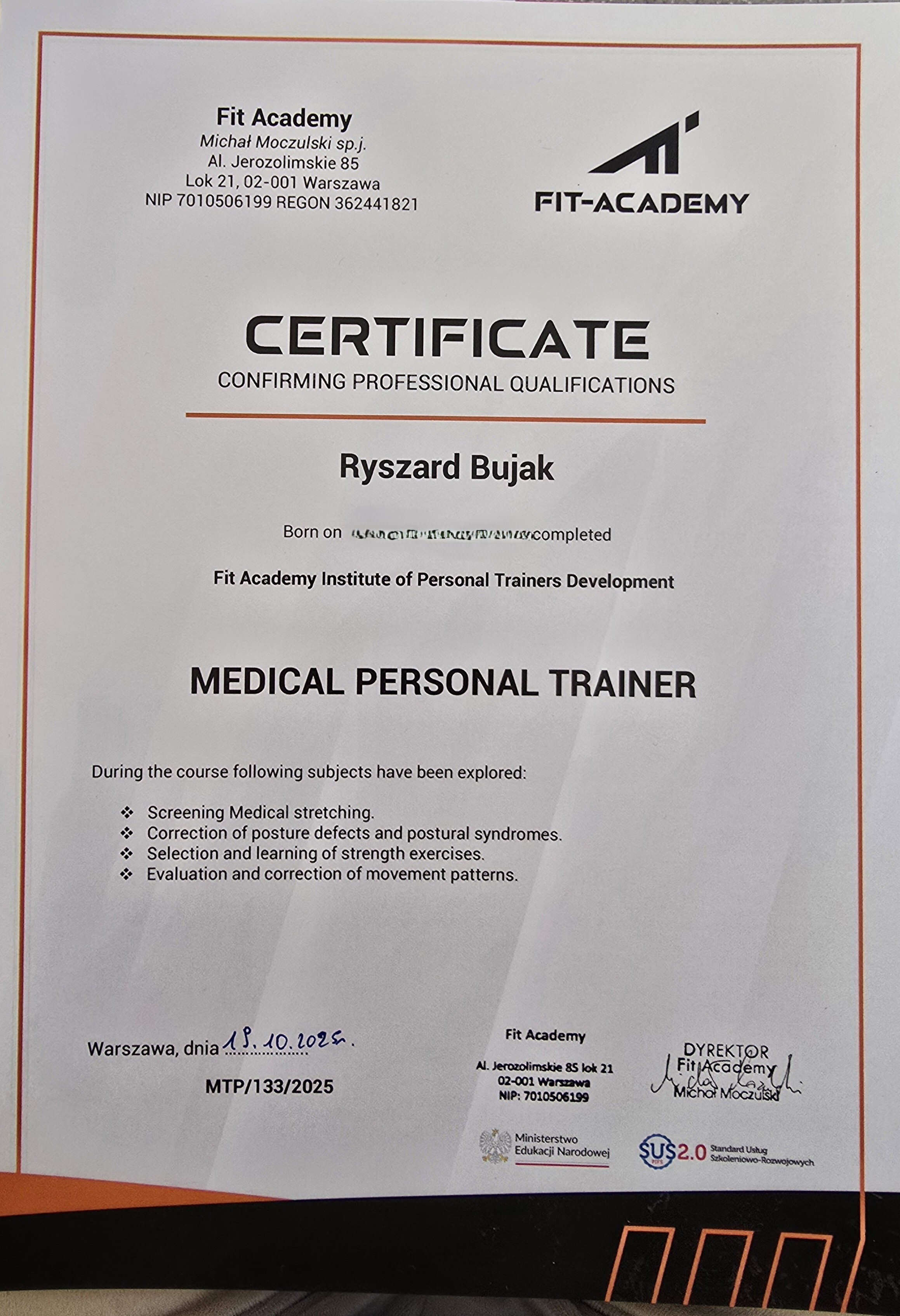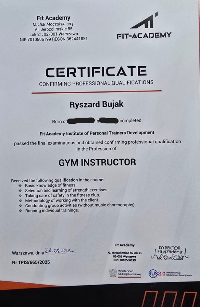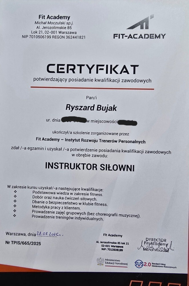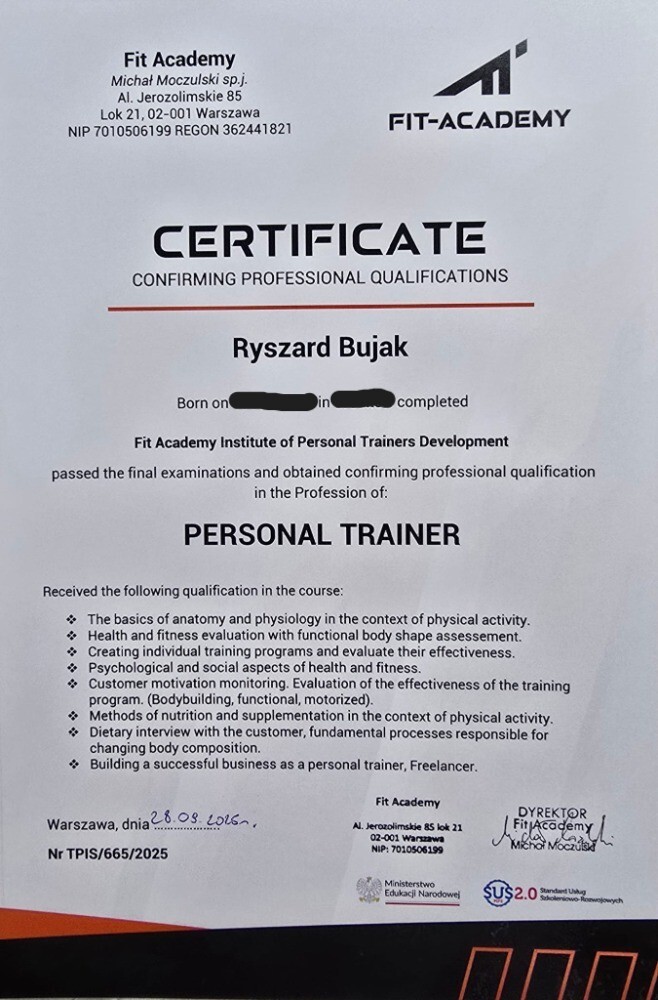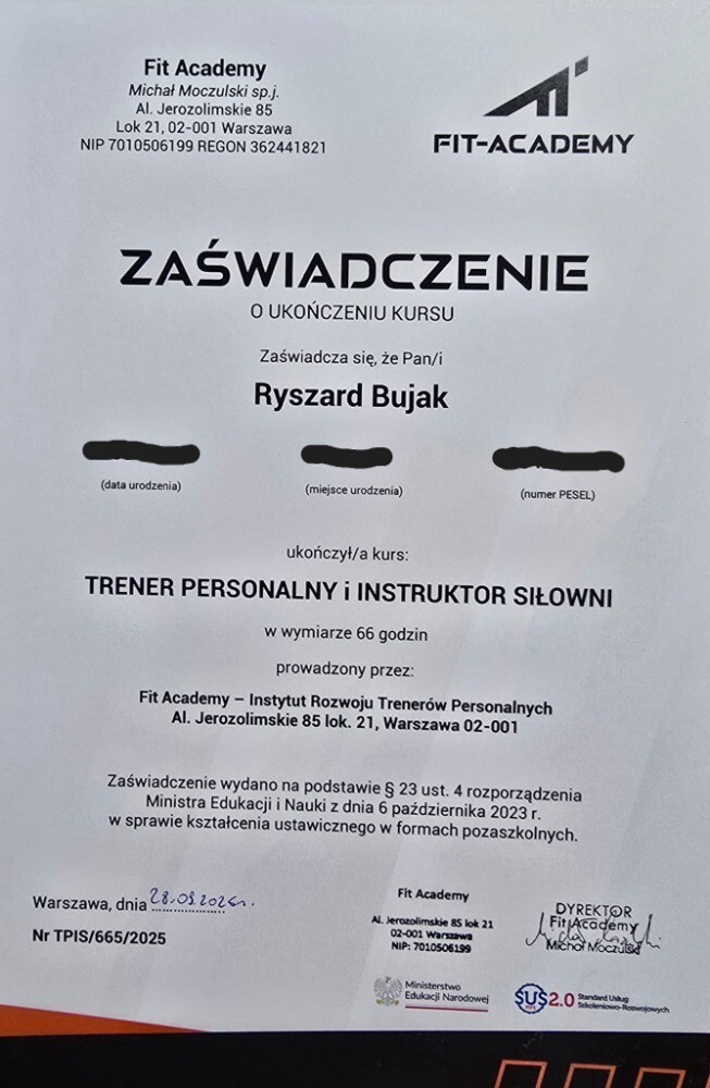 Współpracując ze mną, możesz liczyć na pełne wsparcie, profesjonalizm i... dobrą dawkę humoru. Wierzę, że treningi powinny być wymagające, ale jednocześnie dawać radość i satysfakcję. Nie obiecuję cudów, ale gwarantuję, że jeśli dasz z siebie 100%, razem osiągniemy więcej, niż myślisz. Niezależnie od tego, czy chcesz poprawić swoją sylwetkę, podnieść więcej kilogramów, czy po prostu poczuć się lepiej we własnym ciele – jestem tu, by Ci w tym pomóc.