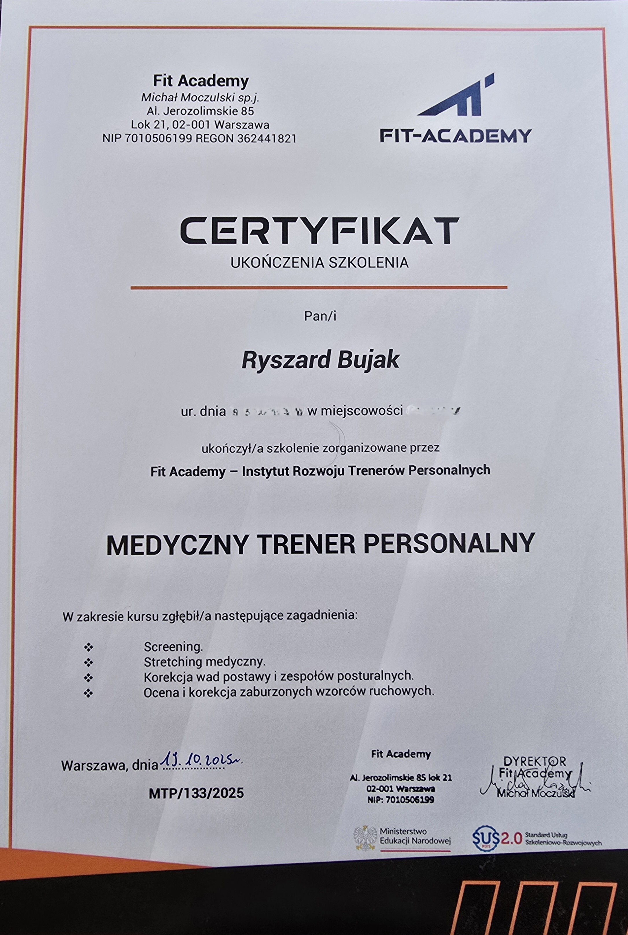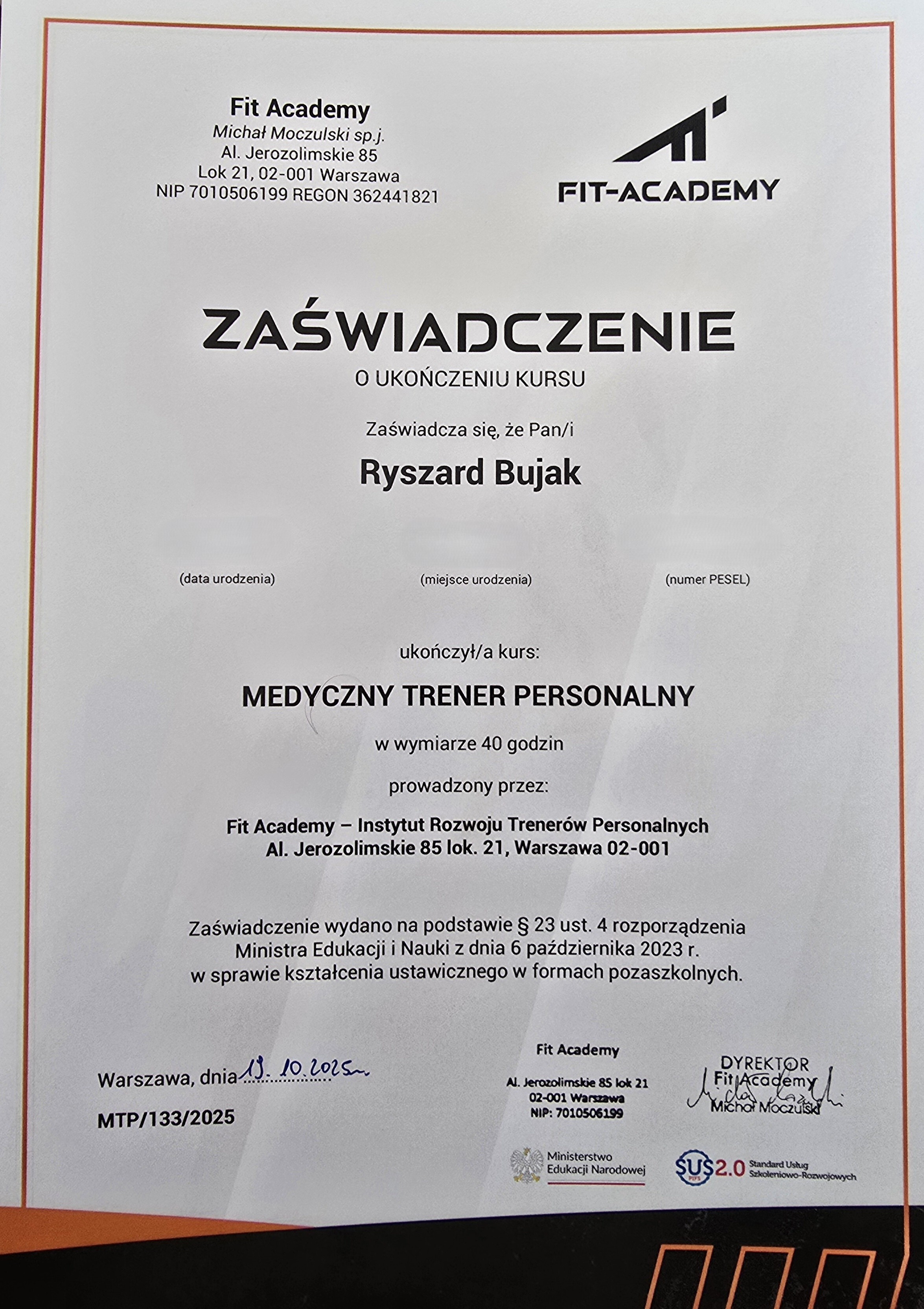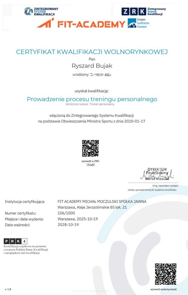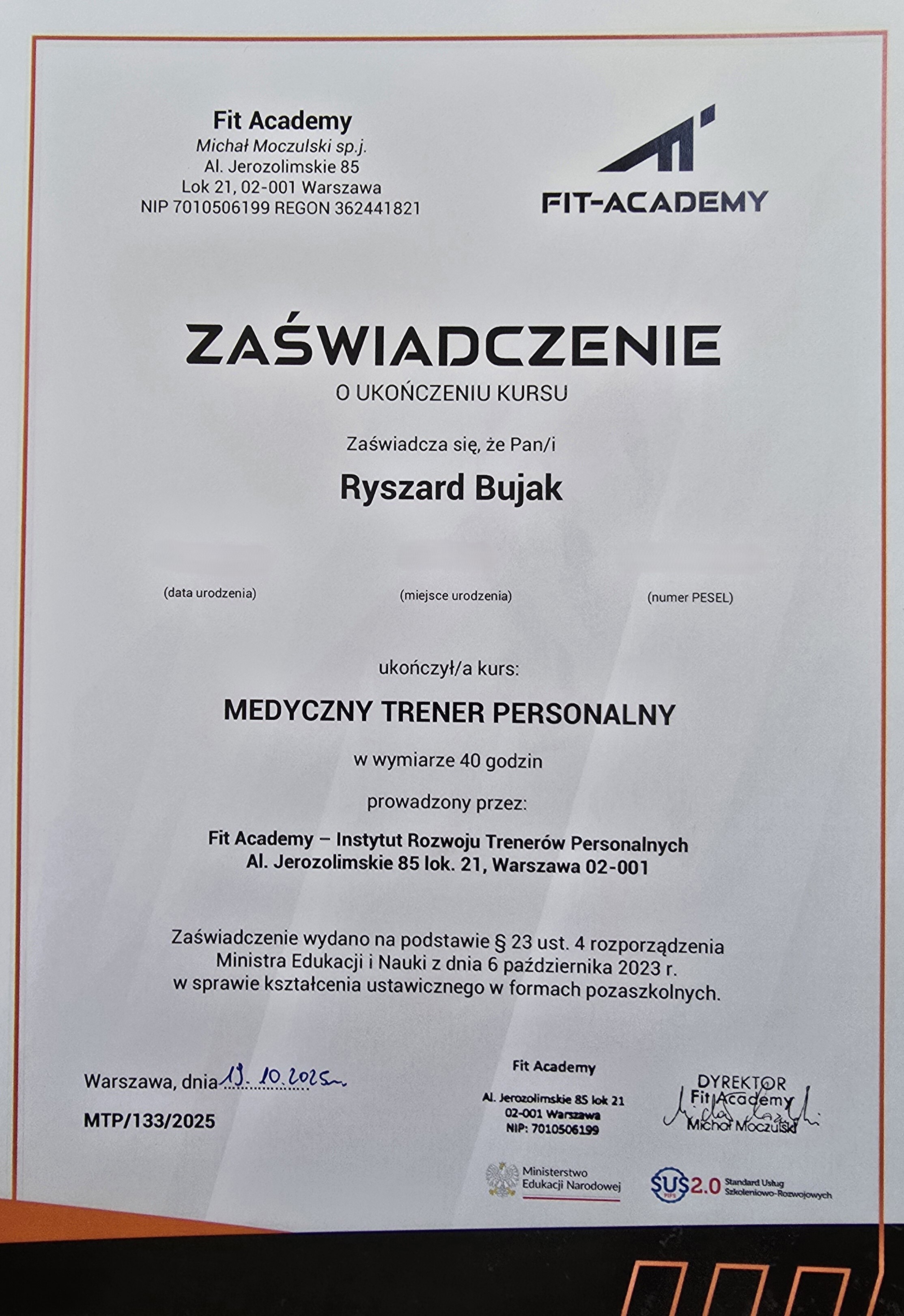Współpracując ze mną, możesz liczyć na pełne wsparcie, profesjonalizm i... dobrą dawkę humoru. Wierzę, że treningi powinny być wymagające, ale jednocześnie dawać radość i satysfakcję. Nie obiecuję cudów, ale gwarantuję, że jeśli dasz z siebie 100%, razem osiągniemy więcej, niż myślisz. Niezależnie od tego, czy chcesz poprawić swoją sylwetkę, podnieść więcej kilogramów, czy po prostu poczuć się lepiej we własnym ciele – jestem tu, by Ci w tym pomóc.